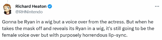 “将会是戴假发的瑞安,但是由女演员配音。当她摘下面具时,露出戴着假发的‘瑞安’的脸,仍然是女声,对着口型。”