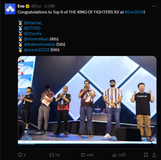 在EVO 2024《拳皇15》决赛舞台上,来自中国的选手“小孩”曾卓君击败中国台湾选手ET夺得冠军。