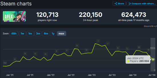 《APEX英雄》作为一款热门射击游戏,Steam在线人数去年还曾达到了62万4473人的峰值,然而一年多之后游戏似乎迎来了一股“退坑潮”,其热度大打折扣,下滑到了2021年25万人左右的水平。