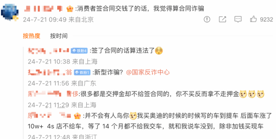 对此,网友表示,消费者签合同交钱了的话,算合同诈骗。有人称,之前买奥迪的时候也遇到类似情况,要加钱才能提车。