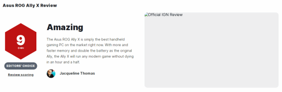 华硕ROG Ally X媒体口碑接近,IGN给出了9分的好评,称其为目前市面上最好的掌上游戏电脑。