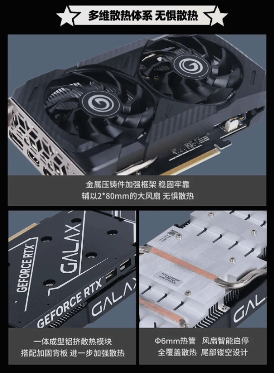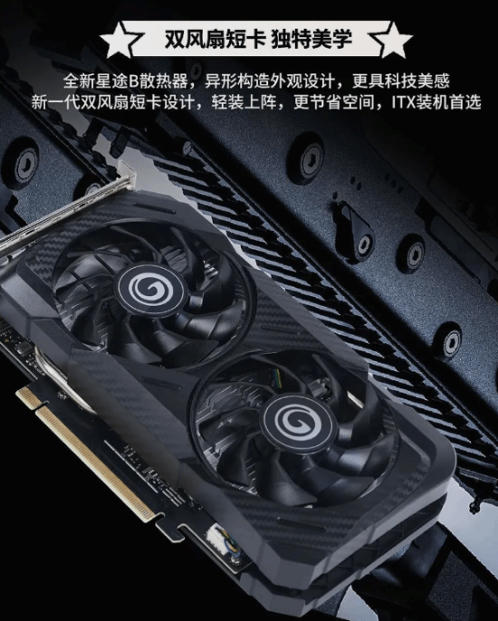 该显卡采用黑色外观,搭配双风扇短卡构造,适配各种小机箱,包括紧凑型的 ITX 机箱。该显卡采用星途 B 散热器,内置 2 个 80mm 散热风扇,支持智能启停技术;结合 6mm 的 S 型镀镍复合热管,覆盖芯片、显存和供电。
