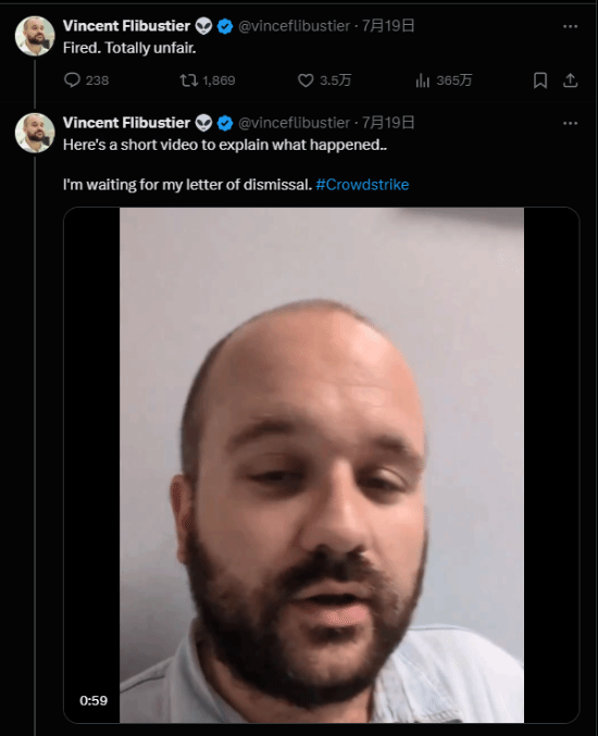 一位名为Vincent Filibuster的讽刺作家发布了一张由AI创作的照片,图片中他站在CrowdStrike办公室旁边并配文“在CrowdStrike的第一天,做了一些更新,现在午饭后休息。”几分钟之内,这张照片就被疯传,收到了数十万个点赞和大量转发。