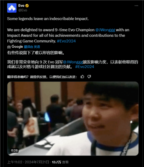 本奖项是EVO官方针对那些为格斗游戏社区带来贡献、冲击和影响的玩家们而规划的荣誉奖项,今年首次颁发。EVO官推也发布推文祝贺:“有些传说留下的影响永不褪色。我们非常荣幸向‘EVO’九冠王Justin Wong颁发这一奖项,以表彰他取得的成就和对格斗游戏社区做出的贡献。”