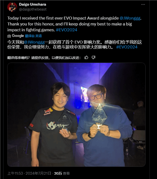 而梅原大吾也在自己的推特发文致谢:“感谢EVO官方给予的这份荣誉,我将继续努力,在格斗游戏中发挥更大的影响力。”Justin Wong也发推回应:“我简直不敢相信!”