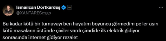 不仅比赛现场情况不断,不少职业选手还吐槽了印度当地的训练条件。Eternal Fire的明星选手XANTARES发文称:“我这辈子从来没见过这么糟糕的赛事,电脑极其糟糕,桌子上有钉子,现在先是停电,然后网络也断了,真是丢人。”