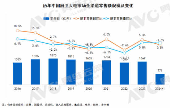 2024年的家电市场整体面临挑战,尤其是厨卫市场,奥维云网(AVC)的总数据显示,2024年上半年,厨卫大型家电的零售量为4149万台,同比微增0.5%,而零售额则达到771亿元,同比下降2.3%。