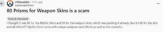 “(他们)暴雪意识到莱因哈特是和天使同等水平的摇钱树并且开始压榨他了。”一位玩家评价道。“80个神话棱晶买武器皮肤就是骗钱”““皮肤很酷,但我不会为了他花80美元的”玩家社区中不乏此类消极的反应,