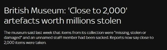 去年八月,大英博物馆大量文物被盗,据《每日电讯报》透露,总丢失文物远超1000,接近2000,价值无可估量。