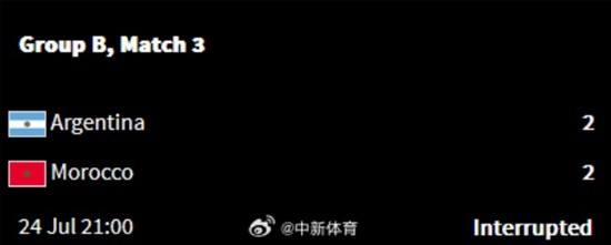 比赛原本应于北京时间24日晚结束,但官方公告称,在阿根廷队于补时第16分钟打入扳平进球后,鉴于现场球迷氛围,出于球员安全考虑,比赛中断,彼时场上比分显示为2:2。