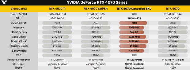 而这个RTX 4070 10GB的核心编号则是AD104-275,显然高出一个档次,CUDA核心数量达7168个,也就是和升级版的RTX 4070 SUPER一致。核心频率也高一些多,基础就有2355MHz,加速达2520MHz。不过显存方面却缩水明显,只有160-bit位宽、10GB容量,带宽也缩水至420GB/s。