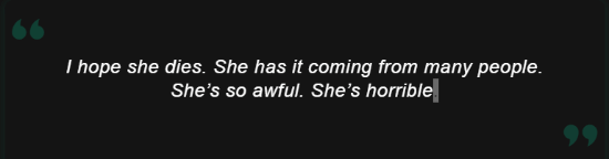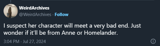 Valorie Curry表示希望鞭炮能在最后一季得到应有的惩罚,她说到:“我希望她在最终季死去,很多人都希望如此,因为她讨厌也太可怕了”,许多粉丝也赞同了她的观点,并猜测她会死于星光或祖国人之手。