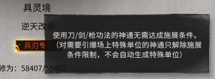 此阶段唯一推荐兵刃专精。使用刀/剑/枪功法的神通无需达成施展条件。(对需要引爆场上特殊单位的神通只接触施展条件限制,不会自动生成特殊单位。)