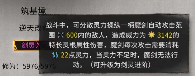 2,剑灵入门。战斗中,可分散灵力操纵一柄魔剑自动攻击范围600内的敌人,造成威力为3142的特长灵根属性伤害,魔剑每次攻击需要消耗22点灵力,当灵力不足时,魔剑无法行动。(可升为剑灵进阶)。但是不推荐继续升级此逆天改命,这只是前期不伤害的。