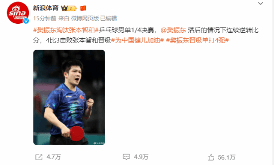樊振东战胜张本智和晋级乒乓男单四强!一度0:2落后