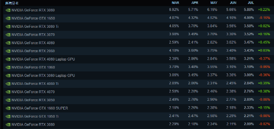 显卡方面,排名第一的RTX 3060份额环比上涨了0.22个百分点,GTX 1650则下降了0.16个点。