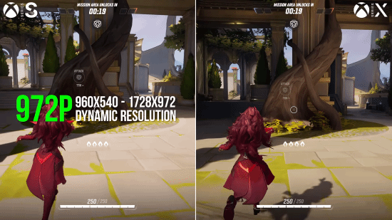 数毛社表示,《漫威争锋》在PS5和Xbox Series X上都使用了Lumen全局光照,并全部以动态1440p分辨率运行,偶尔降至810p。此外,游戏在Xbox Series S上的表现则要更糟糕一些,Xbox Series S版本的《漫威争锋》缺少Lumen全局光照、屏幕空间反射效果和角色阴影,角色模型和环境贴图的纹理质量也较低,且游戏只能以动态972p分辨率运行。而在更复杂的场景里,游戏的分辨率甚至会降至540p从而稳定到60帧。