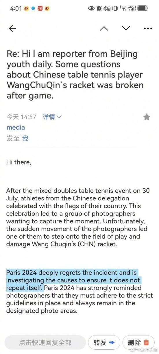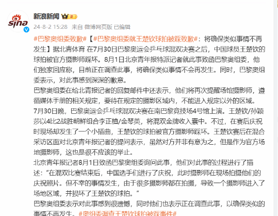 据新浪新闻援引北青体育消息:在7月30日巴黎奥运会乒乓球混双决赛之后,中国球员王楚钦的球拍被官方摄影师踩坏。8月1日北京青年报特派记者就此事致函巴黎奥组委,他们独家回应称,目前正在调查此事,将确保类似事情不会再发生。同时,巴黎奥组委表示,对此事感到深深的歉意。