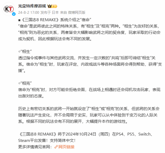 8月2日,光荣特库摩官方发布了《三国志8 REMAKE》的“宿命”系统介绍。官方表示,“宿命”是武将彼此之间的特殊关系,有“相生”及“相克”两种。“相生”为友好的关系,“相克”则为恶劣的关系,两者皆会大幅影响武将之间的契合度,玩家采取的行动会成为契机,因此根据玩法会有不同的发展。