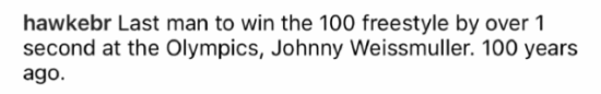 而近期,布雷特·霍克再次在INS发帖,表示上一次在奥运会100米自由泳以超过1秒之差赢得对手是约翰尼·韦斯默勒(Johnny Weissmuller),还特意强调了这是100年前的事。然而这回,布雷特·霍克却关闭了帖子的评论区。有网友认为布雷特·霍克疑似借此帖阴阳潘展乐。