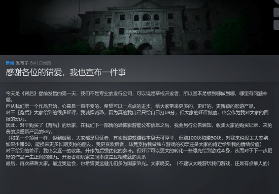 为了感谢玩家们的支持,开发团队宣布“对于购买了《背后》的玩家,在我们下一部新的恐怖影游能公布信息之后,我会另行公告通知,收集大家的购买记录,来免费的送赠新产品的key。”