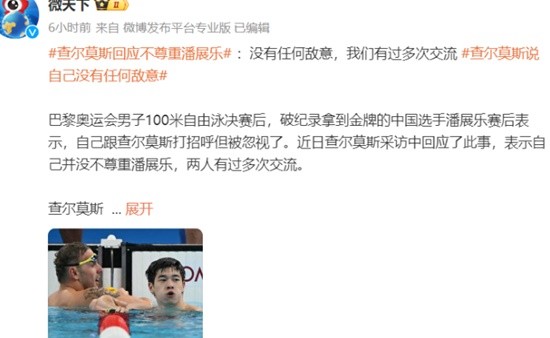 据微天下报道,巴黎奥运会男子100米自由泳决赛后,破纪录拿到金牌的中国选手潘展乐赛后表示,自己跟查尔莫斯打招呼但被忽视了。近日查尔莫斯采访中回应了此事,表示自己并没不尊重潘展乐,两人有过多次交流。