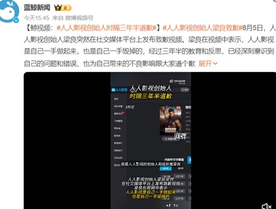 据蓝鲸新闻报道,人人影视创始人梁良突然在社交媒体平台上发布致歉视频。