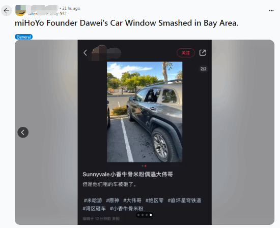 米哈游大伟哥疑在美国被砸车 外网热议:小偷刷圣遗物?