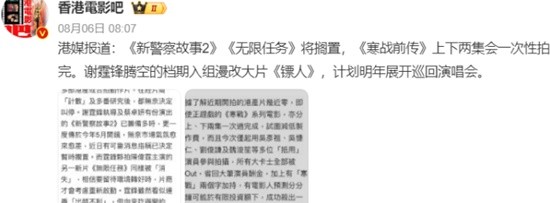 据香港電影吧报道,港媒消息:《新警察故事2》《无限任务》将搁置,《寒战前传》上下两集会一次性拍完。谢霆锋腾空的档期入组漫改大片《镖人》,计划明年展开巡回演唱会。