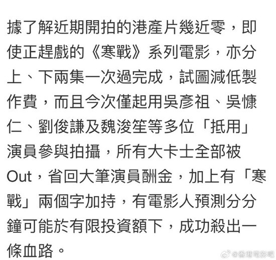 谢霆锋、张学友、林嘉欣、吴镇宇主演《海关战线》扑街以后,多部合拍港片项目已经被资本抛弃。香港合拍警匪片最近只有《寒战》前传开机,吴彦祖、吴慷仁、刘俊谦同样拿不到天价片酬,还分上下两集减轻市场压力。