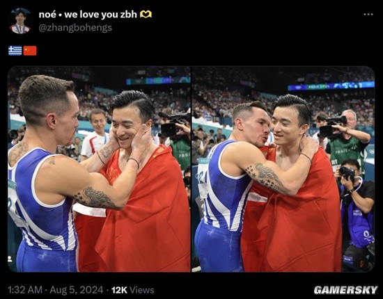 刘洋吊环比赛夺金后 希腊选手捧着他脸的图片引发热议