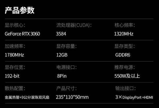 昂达 RTX3060 神盾 12GD6-B 显卡参数如下: