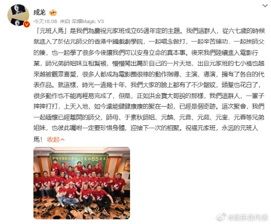 8月12日,著名演员成龙发文纪念元家班成立65周年,并晒出和同门们的大合照。成龙提到元奎“已经离开”——“这次聚会,我们一起缅怀已经离开的师父、师母、于素秋师姐、元麟、元音、元茹、元奎、元蓉等兄弟姐妹,也彼此嘱咐一定要珍惜身体,迎接下一次的相聚。祝福元家班,永远的元班人马!”