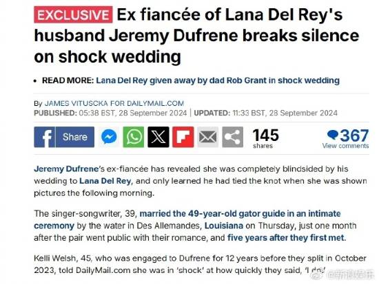 新浪娱乐消息,据外媒,打雷姐Lana Del Rey老公Jeremy Dufrene的前未婚妻Kelli Welsh接受采访,表示对他和打雷姐结婚很震惊, “因为我们订婚12年了(都没结婚),但他(和打雷姐谈恋爱)一个月后就结婚了。”