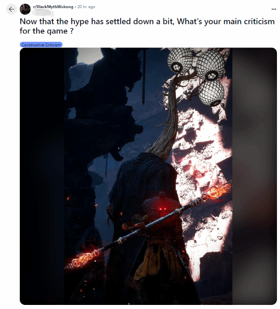 近日,Reddit上有玩家发帖:现在《黑神话》的热度已经褪去了一些,来说说这款游戏的不足之处吧。