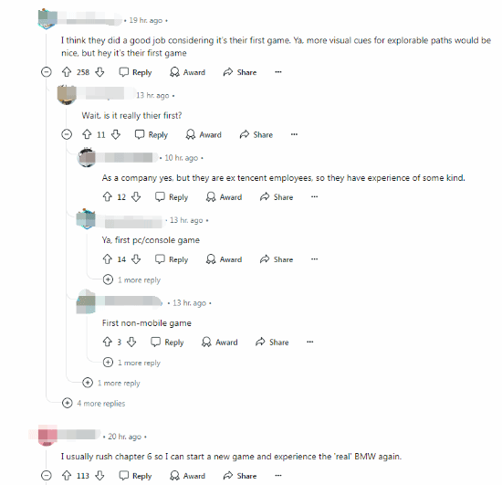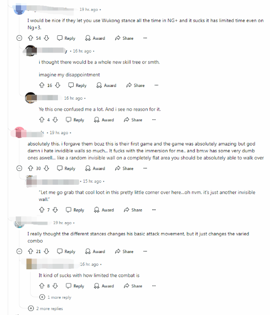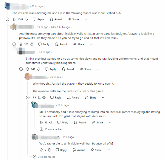 评论区大部分网友都认为空气墙是《黑神话》的主要问题所在。“关于隐形墙最恼人的部分是,某些时候它被设计成看起来像一条通道,让你试着去撞那堵看不见的墙。”还有玩家认为,不能长久体验大圣模式也是缺点,但考虑到游科在经验上的欠缺,大家都愿意给他们时间来成长。