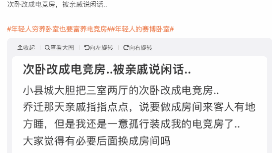 与此同时,也有网友反应自己想要将次卧甚至部分客厅空间打造电竞放的想法遭到家长的反对,家长大多以“客人来了没地方呆”予以反驳。