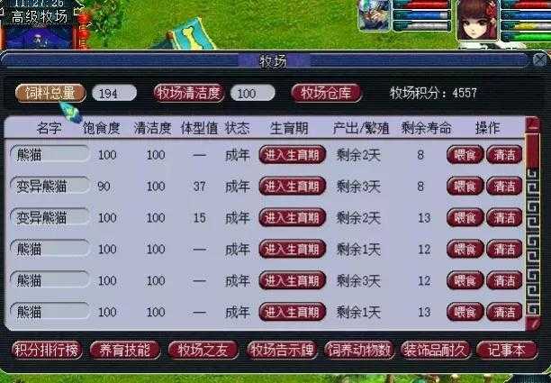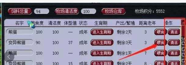 珍稀类-熊猫 从养的时候一直到一直到距老年还有5天这期间喂满,其他天数保持最低80饱食度即可。