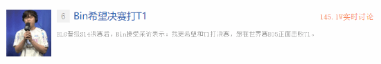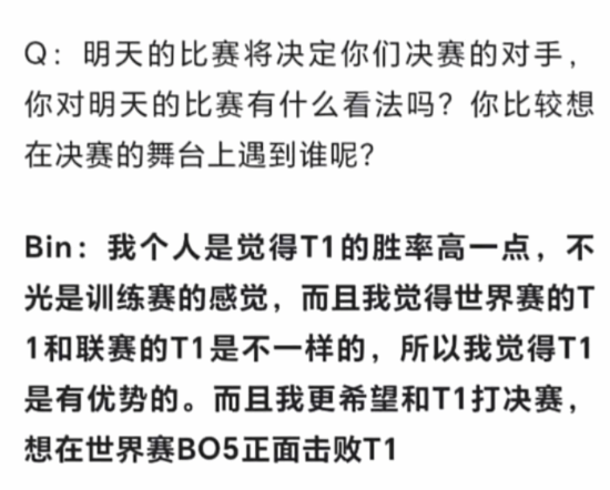 在赛后采访中,Bin选手透露BLG一直有和T1打训练赛,对他们的实力非常认可,所以他认为T1的胜率更高一点:“而且我更希望能和T1打决赛,想在世界赛BO5正面击败T1。”截止至发稿时,话题“Bin希望决赛打T1”登上贴吧热议榜第6位。