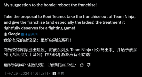 还有玩家建议直接重启《死或生》系列:“给光荣提议把《死或生》系列从忍者组手里分离出来,并给予该系列作为格斗游戏应有的待遇!(我猜指的是像《真人快打》系列一样重启。)”