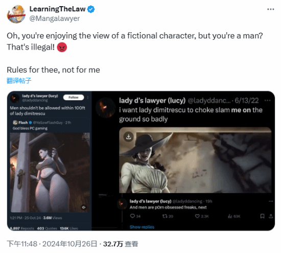 日前,推主Mangalawyer参与了这场骂战,并发推评价了此事,说道:“对于因其他玩家选用可选模组Mods而感到不悦,而这些Mod根本不会改变原始角色的人,他们在电子游戏领域根本就没有发言权,这种愚蠢的观点只有在硬核女权主义介入后才浮出水面,成为女同性恋者只是为这种虚伪增添了一层遮羞布。”