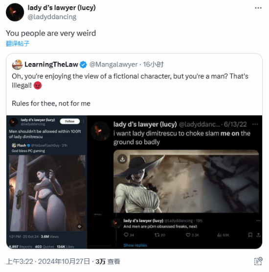 此前有推主分享了一段《生化危机8》八尺夫人比基尼的Mod演示,尽管大部分玩家都比较喜欢这段演示,但这段演示还是遭到了一些非议,随即掀起了一场骂战。