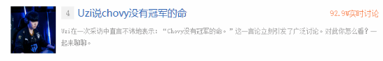 在直播中,Uzi谈到:“Chovy这兄弟是不是没有冠军的命啊!联赛也老是第二,哦联赛第一还挺多的。这人实力很强啊!对,跟主播一样是吧,要不退了算了。”截止至发稿时,话题“Uzi说chovy没有冠军的命”已登上贴吧热议榜第四。