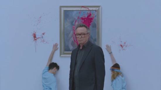 视频中,两位环保主义者混入博物馆,卸下伪装后露出了T恤上抗议石油的标语,并将油漆泼撒到一副油画上,同时将自己的一只手牢牢粘在墙壁上。而两人还在滔滔不绝发言时,被管理者上来直接爆头。通过视频不难看出剧集导演对极端环保者的痛恨。