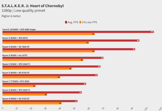 问题出现在低端PC配置上。GSC Game World最低要求是Core i7 7700K搭配GeForce GTX 1060这样的配置,足以支持1080p分辨率和低画质下的30帧运行。从测试看,这一说法基本成立。不过,这样的老旧CPU需要很长时间处理着色器编译,同时会对1%低帧率造成明显影响。换句话说,游戏体验并不理想。而考虑到即便是顶级配置的PC也可能在《潜行者2》中遇到卡顿和性能问题,八年前的CPU和GPU组合可能会面临更多困难。至于光追功能,测试指出大部分PC配置都可以体验,但入门门槛很高。