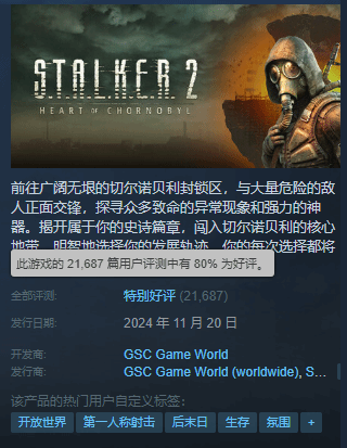 在发售两天后,《潜行者2:切尔诺贝利之心》口碑迎来好转,截至发稿前,一有21687条评价,从首发“褒贬不一”升至“特别好评”,好评率从61%升至80%。