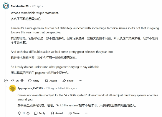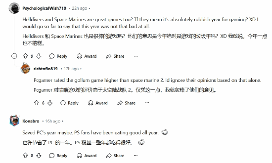 一名玩家直接表示:“我完全不同意PC Gamer的观点,我认为今年的游戏表现并不糟糕。”