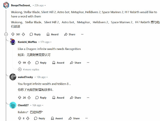 一些玩家将这一文章转发至Reddit,表达了他们的疑惑和不满。一位网友写道:“难道《宇宙机器人》、《黑神话:悟空》、《寂静岭2》等等就不足以让2024年成为一个值得纪念的游戏年份吗?”评论区也展开了讨论。