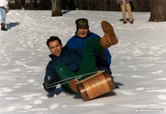 1991年,乔治·Hw·布什与阿诺德·施瓦辛格在戴维营乘坐雪橇。