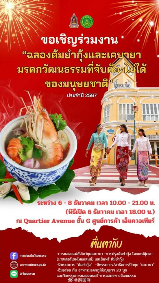 对此,文化部邀请全体泰国民众在这个即将到来的欢乐时刻,一同前去曼谷EmQuartier购物中心G层参加由文化部于12月6-8日举办的“冬阴功”和“娘惹衫(Kebaya)”申遗庆祝活动。届时,将有知名餐厅主厨亲自制作冬阴功以供免费品尝,还有Kebaya展览及音乐表演。